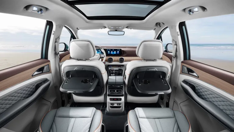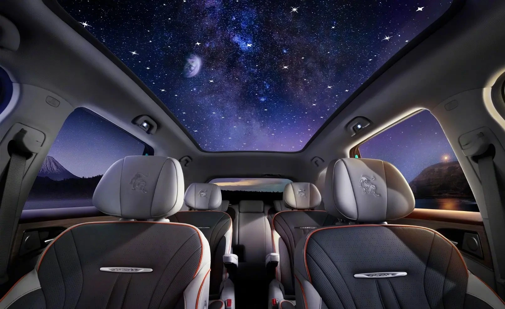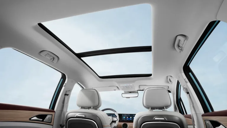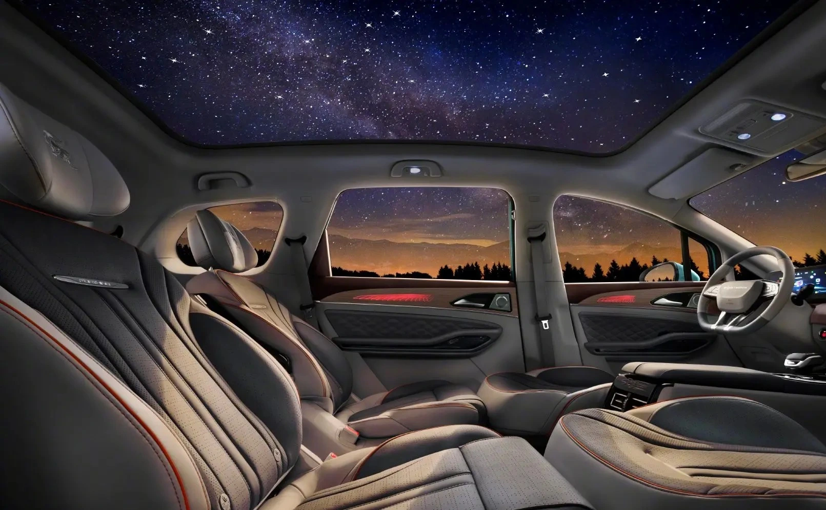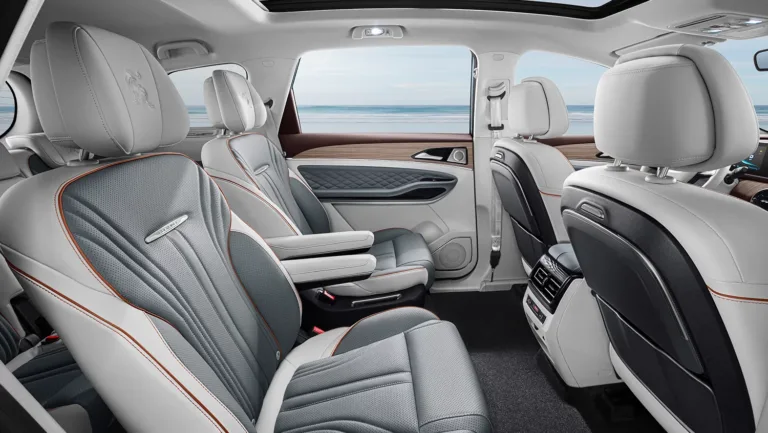 Notranjost vozila odlikuje široka sredinska konzola, dva velika 12-palčna informacijsko-razvedrilna zaslona ter dekorativni elementi v videzu lesa. Voznikov in sovoznikov sedež sta opremljena z ogrevanjem in prezračevanjem, kar zagotavlja udobje v vseh letnih časih. Dodatno razkošje prinaša pomična steklena streha, ki osvetljuje notranjost z naravno svetlobo.